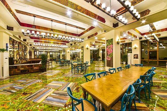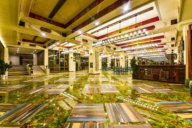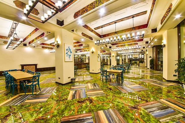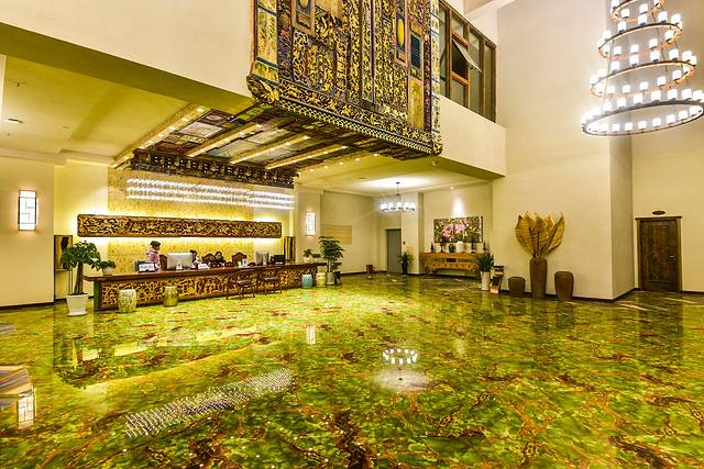 再来就是地面上的装饰也是相当的震撼,地面采用了全国酒店中罕见的大理石、花岗岩以及冰裂石等多重美丽而珍贵的矿石组合而成的地面。