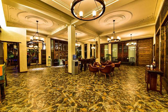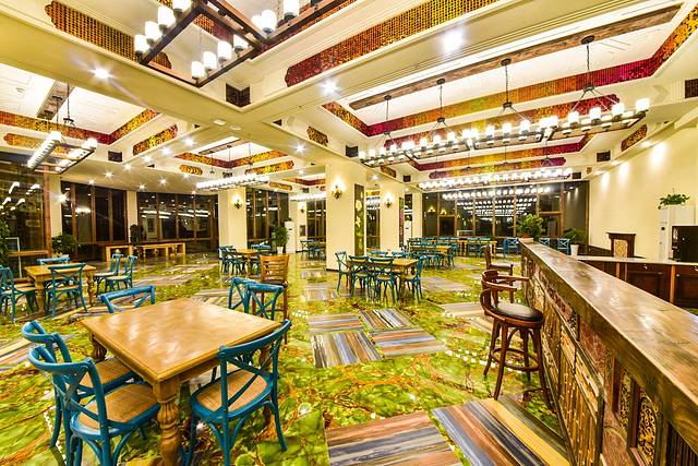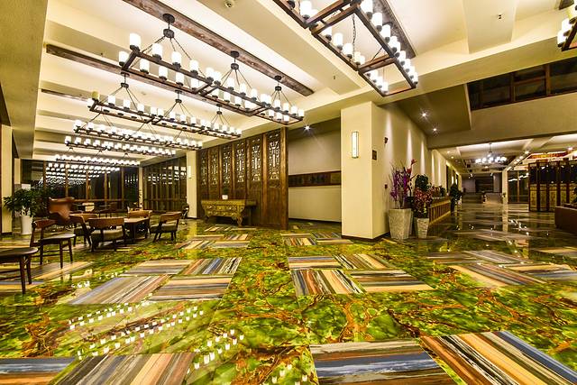 再来就是地面上的装饰也是相当的震撼,地面采用了全国酒店中罕见的大理石、花岗岩以及冰裂石等多重美丽而珍贵的矿石组合而成的地面。进入大厅如同进入了皇宫一样,立马让人觉得山庄的档次一下子提升了很高的身价价值了。