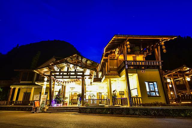 夜晚从机场驱车到达双河谷游客服务中心就远远的看到了灯火辉煌般的村落打破了整个温泉镇的宁静与清闲。起初,山野君还以为我们找错了地方,以为这是到了一个村庄里来了,经过游客中心的工作人员的提醒后才放心的继续前行,到了我们下榻的双河客栈了。这里的度假村模式的住宿群不仅仅充满了艺术范儿的韵味,更是在错落有致、规模壮观的外景之下,让人觉得这里哪是客栈呀?这简直就是高级、娴雅与上档次的度假村的山庄嘛。这个时候觉得这里被称之为中国最大最有艺术的客栈真的名副其实的。因为真的很难在哪里能够将这里好几个村落的老房舍改建成如此大规模的度假村山庄模式的客栈,有点意外。与其说是一种意外,到不如说是喜出望外。规模庞大、设计颇有仪式感以及原汁原味的村寨气息是这家双河客栈给山野君最大的也是最深刻的印象了。