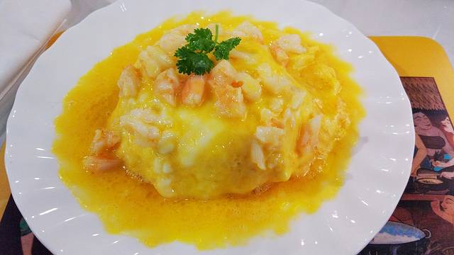 一大片煎蛋包裹着米饭,上面是覆盖的鲜虾仁,这款米饭卖相很好,味道却清淡,淋上搭配的酱汁提味,味道立马鲜香起来。