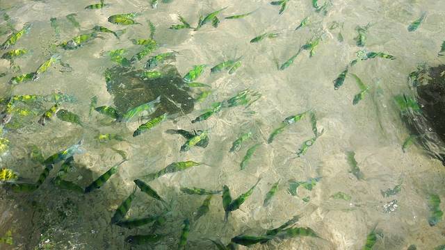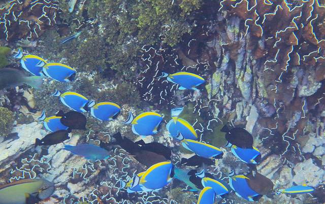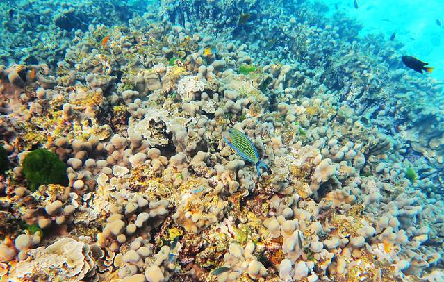这还是一个浮潜的好去处,阳光正好洒在海湾,海底大片的珊瑚,五颜六色的珊瑚鱼在阳光照射下五光十色。