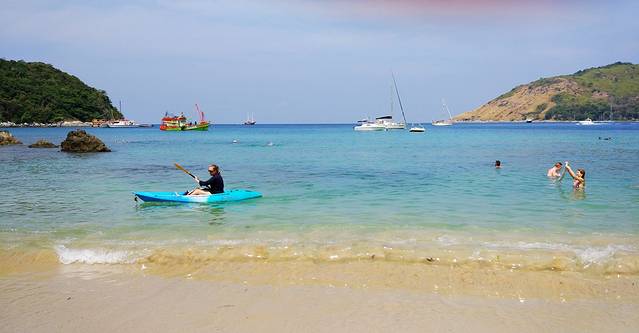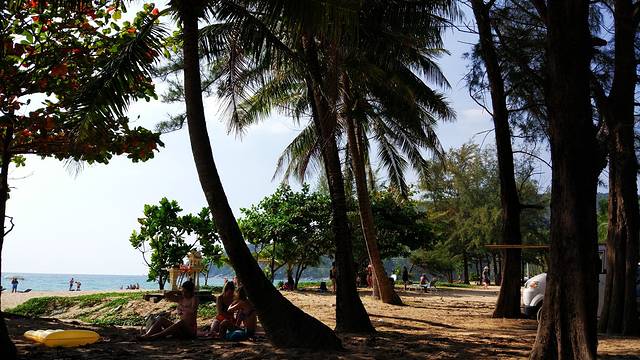 Nai Harn Beach是个比Yanui Beach大得多的海湾,这里浪比较大,只有靠近东北的小犄角风浪比较小,很多带着小盆友的家庭在这里享受阳光沙滩做日光浴,人和人不一样,怕晒的我们只能躲在树荫下做旁观者。