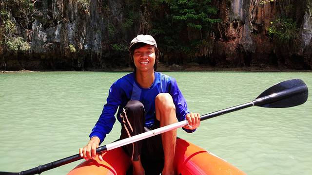 我碰到的是个有文艺心的热情船夫,途中用树叶做成心形框住笑脸帮你拍照。太阳光太过强烈,当那些形象各异的小岛出现在眼前,不经船夫指点有些还真看不出期间的名堂。洞中的奇石怪峰,给人奇妙的感觉。皮划艇探洞还是值得尝试一下,很棒的体验。然而也许是游客太多,看不到蝙蝠也看不到猴子。