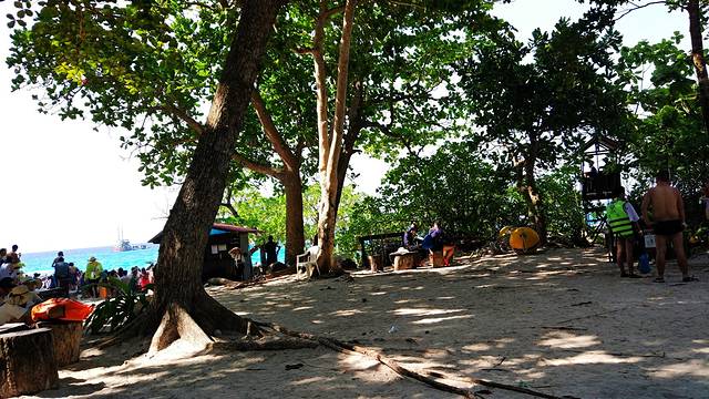 然而将近两个小时的大皇帝岛自由活动有点难受,虽然这里水清沙幼、景色绝美,非常适合潜水或者沙滩漫步,但是正午太阳暴晒根本就不想在太阳底下活动,只想哪儿凉快哪儿呆着。岸上但凡有点阴凉的地方都摆着收费的桌椅,一个太阳伞的位置200泰铢,岛上所有的设施都要收费,洗手间一次20泰铢,冲淡水一次200泰铢。有经验的老司机能被这难倒?取出浴巾和救生衣铺在礁石上休息,睡个午觉。