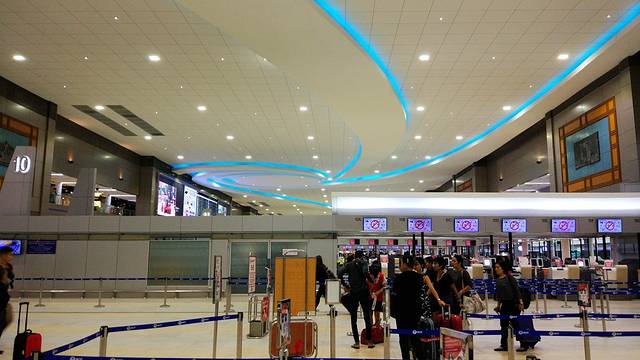 廊曼机场大厅屋顶的淡蓝绿色光圈勾勒出的线条简单而美丽,是我很喜欢的,机场所有标识均有中文,语音播报也有中文,可见这里早已是中国人的天下。也许是和中午的反差太大,有点喜欢这个机场了。