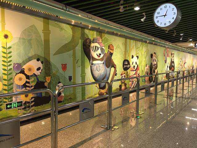 从酒店出来坐地铁三号线到熊猫大道(地铁票和地铁站里都是熊猫哦),再坐d025公交车,一站到熊猫基地。门票可以在大众点评上买,能便宜一点,在基地门口可以通过自助取票机取票。