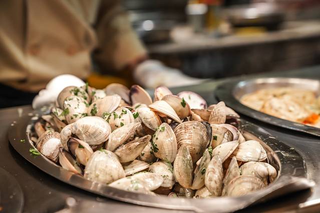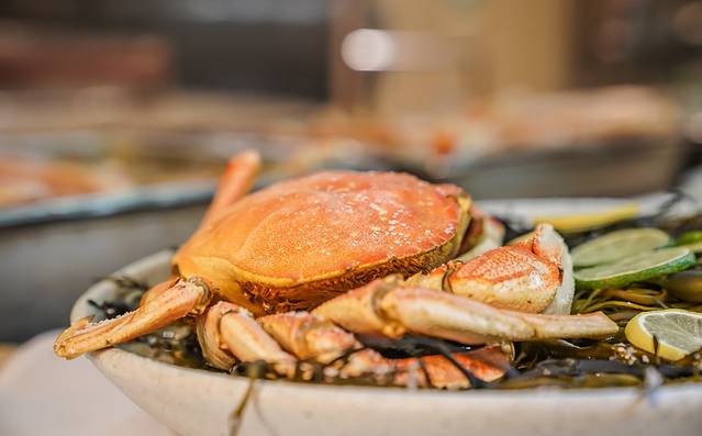 海鲜种类非常丰富,最大的亮点就是无限量供应的阿拉斯加帝王蟹脚和三种鱼子酱,其它生蚝,青口,三文鱼,金枪鱼,虾也都极为新鲜可口,并大量采用了中式和日式的烹调方法,更合东方人的口味。