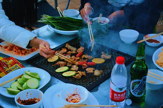 而是一群人坐下来,围在烤炉四周,慢慢地享受这闲暇时光