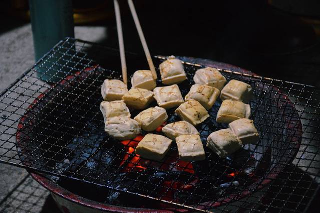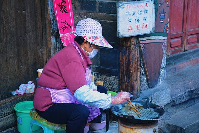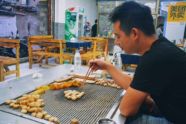 老板一边不停翻转着豆腐的正反面,一边跟我们聊起这几天在云南都玩了些什么