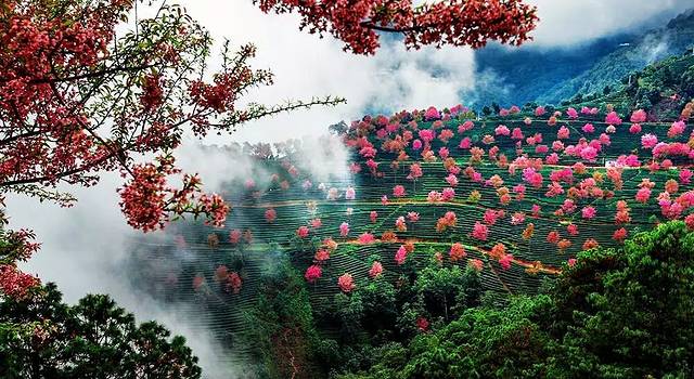 在云南,冬天开花本不是什么新鲜事,但是在绵延千里的无量山的一个谷地里,一块千亩的美丽茶园中数万株樱花一起绽放开来。