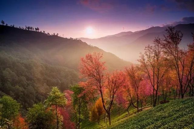 不一会儿,就能看到日出的景象,一束束的光芒打亮了层层茶山,强烈地明暗对比下,阡陌纵横的茶山上一簇簇樱花生动可人。