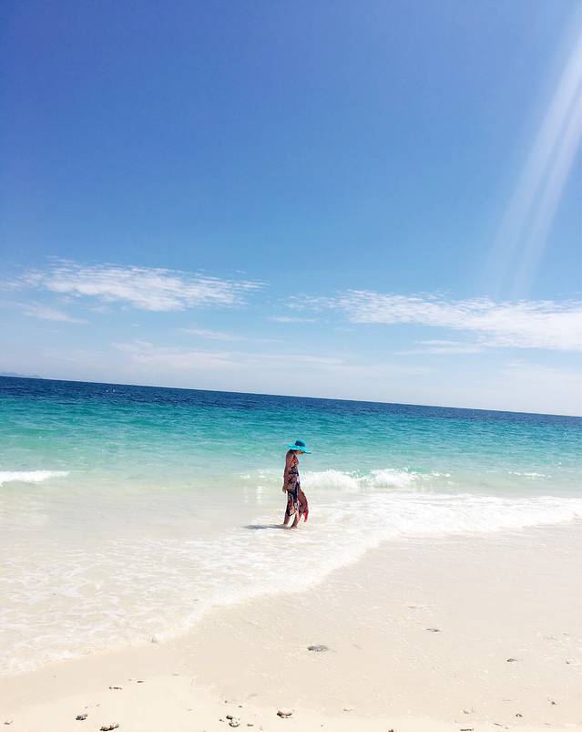 登岛后穿过丛林可以在岸边玩,天气太好,水太蓝,白色的沙子太细,海天一色美的语无伦次!