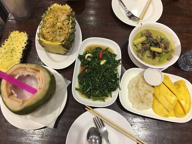 由于闺蜜和她妈妈都晕了船,晚餐只有我和妈妈俩人吃,芒果糯米饭、菠萝饭、咖喱、椰汁,剧有泰国特色的晚餐😄泰国青菜的种类特别少,所以空心菜也是每桌必点啦!