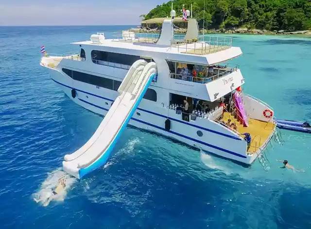 不得不说,在皇帝岛的浮潜时间真长,但我深潜回来背着氧气瓶实在太重啦,体力透资就没再去浮潜,想着还有一次浮潜,结果后来我选择了上岛,好后悔没玩到水滑梯。吃过午餐,开往大皇帝岛,由于船载太大,我们换乘长尾船上岛,也可以不上岛在浮潜点浮潜!