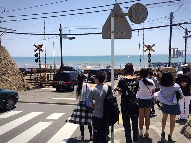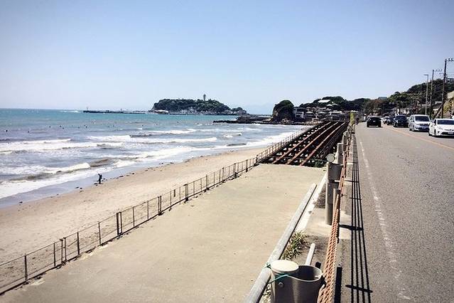 他脑袋左边的就是江之岛。可惜现在海岸边在维修,会照到很多钢架