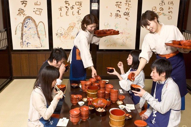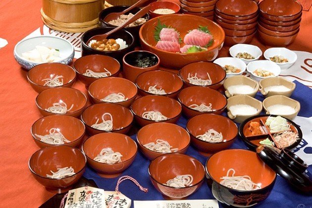 在当地餐厅品尝Wanko Soba时,“一旦碗空了,另一碗盛有面条的碗就会放在这个空碗上,所以最后在食客面前会出现一叠高高的空面碗。各种各样的浇头加入其中以提供多种不同风味。当食客吃饱时,他迅速将盖子放在最后一个空碗上。这表示食客已经吃饱。10 至 15 碗碗仔荞麦面相当于一碗普通的荞麦面。”