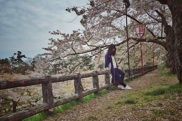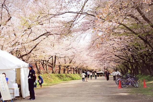 弘前公园的樱花盛放时,护城河的水面上铺满了花瓣织成的绒毯,穿过道路两侧盛放的樱花搭起的樱花隧道,沉浸在粉嫩的海洋。弘前樱花祭也是东北小吃舞台的集合。”