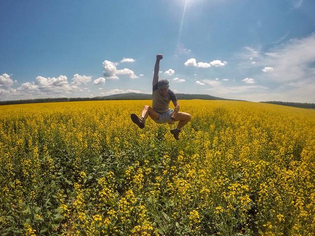 深陷这样无限广阔的异色海洋之中,蓝、黄两色占据了所有空间,而那明黄又如烈焰般耀眼夺目,与蓝天白云遥相呼应。