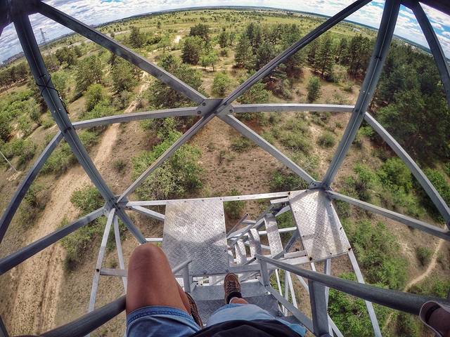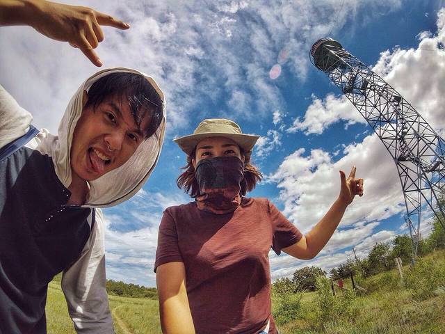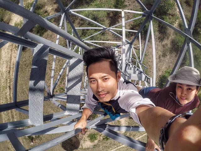 走到公园复地发现一座瞭望塔,应该是用于火情监测,绝对是一个暂时告别蚊虫的好去处,又是一个绝佳的观景台。 我们一跃而上,我突前,保镖垫后,以备我万一失手落下而充当气垫的作用。