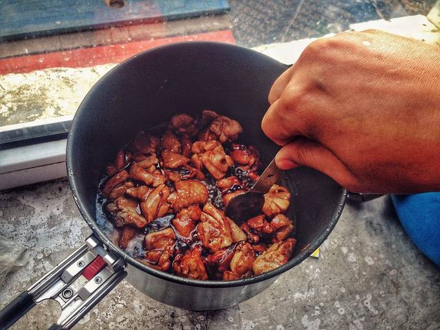 今天的新鲜食材取自海拉尔的菜市场,价钱略高于内地,不过一个大鸡腿也只有8块钱。炒过糖色过将切块的鸡腿肉放入翻炒,鸡块呈金黄色时放入土豆。
