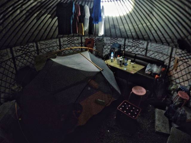 后来被上图这位汉子安排在他家马场的一座蒙古包内,来了一座“包中包”的营地。而这一晚随后的节目在酒瓶叮铃咣当的撞击声开始...只记得杨哥在讲述他在虎跳峡的密封船舱内独自与呕吐物、粪便翻腾48小时的梗后,我跑到包外,在连贯的呕声下结束了这一天的节目。