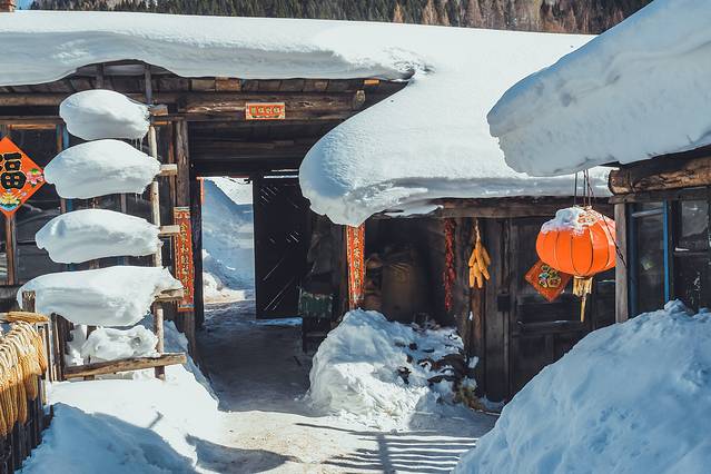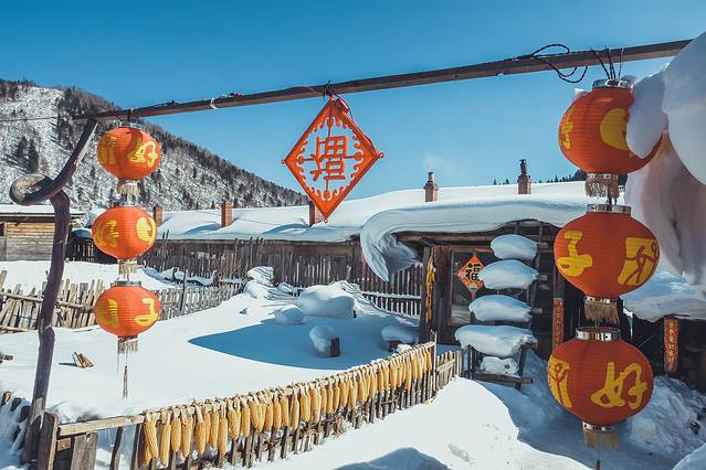 家家户户挂起串串红灯笼,把那素雅的银装世界装点映衬得如梦幻般美丽生动。迷蒙的点点红色,让这素白的世界多了点点温暖。玉米棒子在木榼愣的房檐下闪烁着金色的光芒,冰糖葫芦串插在稻草扎成的柱子上,木栏杆上搭着野鸡、野兔等野味,铺子里典型的雪乡商品就是那些毛皮的货物。要说每一个东北男人的脖子上都挂着一根手指粗的项链那绝对是没有的事,可基本上每个女人,都会有那么一两件貂绒,毕竟,这是属于东北女人们的时髦单品。
