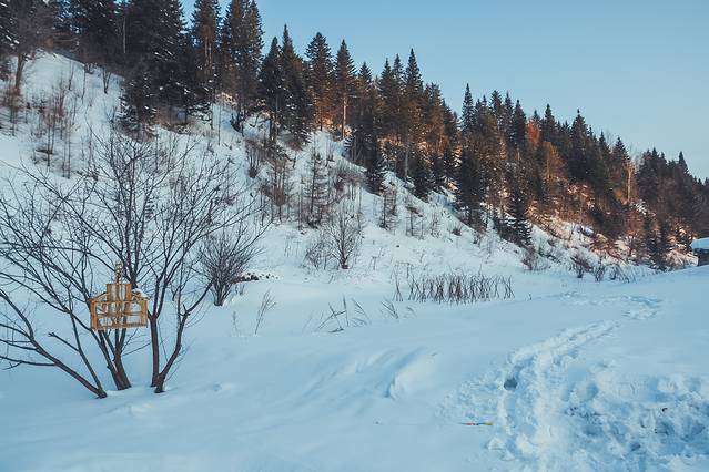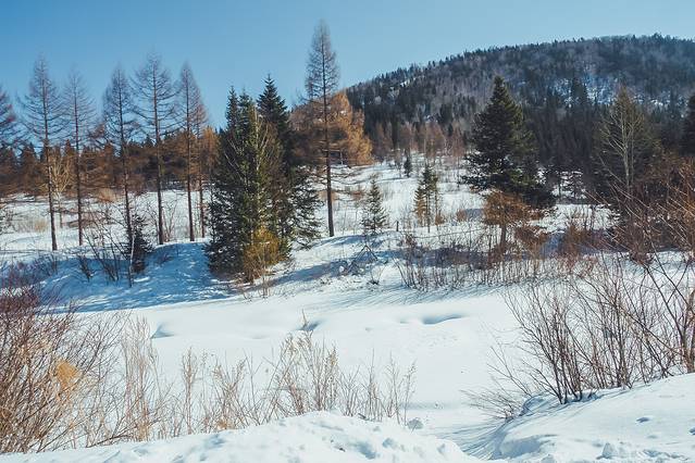 阳光洒下来,落叶松立刻迸出金子般的光辉,其他的树则摇曳着银光,而其实,如果没有积雪覆盖,这里的很多树叶,都还是青翠的绿色,充满生机。