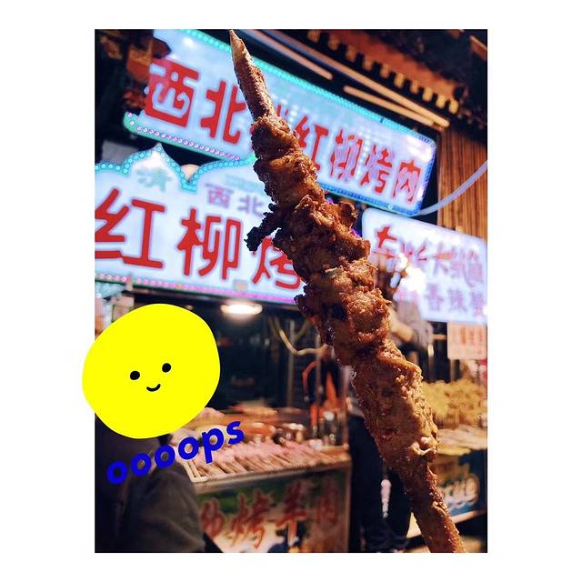 一整条街都在卖的红柳烤肉,10块一串,味道还可以,尽管我们已经吃饭了,但是还是忍不住买来吃~