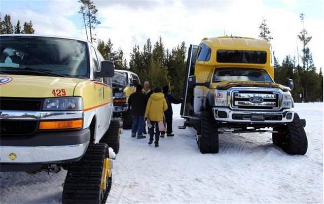 从旧金山出发来到黄石公园北门,冬季的黄石公园私家车是不能进入景区深处的,因为雪太大了,有些道路也不能通行了,只是停在边缘的房车营地。进入景区则要乘坐景区的雪地车。看到这个霸气的车轮了么,像坦克车吧,只是轮子是三角形的。也有骑雪地摩托的,但是我们几个技术有限,没敢尝试。