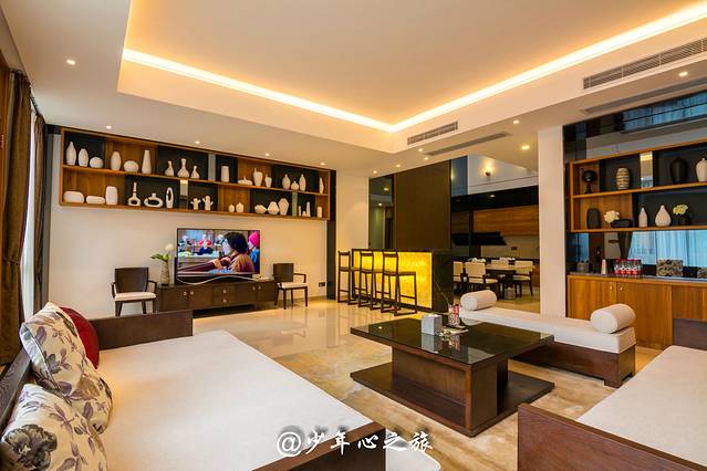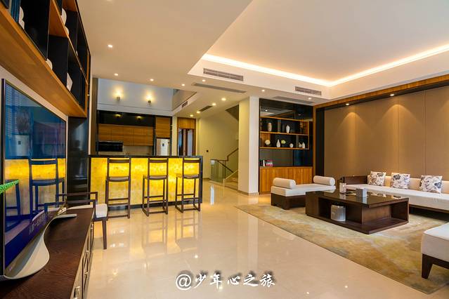打开别墅门,抑制不住的惊喜,超大的空间和窄窄的庭院门形成了鲜明的对比,电视、古董、躺椅、抱枕、如果我想要一栋梦想中的大房子,或许就是这个样子。△