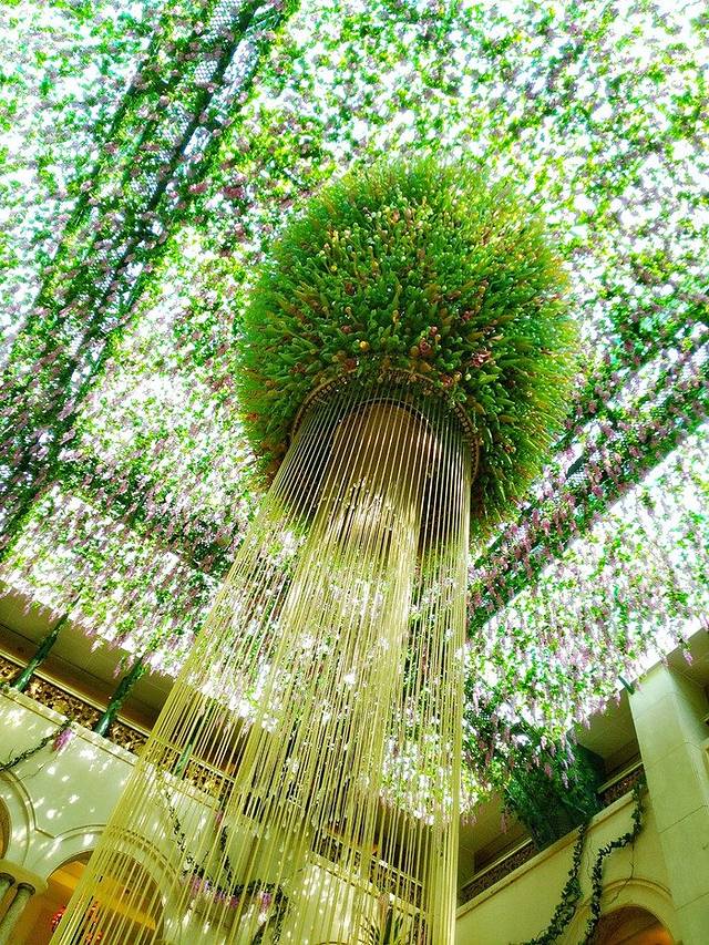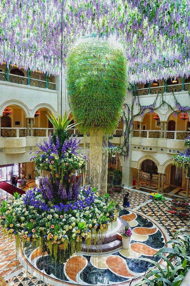 行色匆匆,满身疲惫,一踏进茵特拉根的大堂,仿佛进入了梦中的世界:舒适的温度,氤氲的微香,以及满挂的紫藤萝,花色热情、热闹,清脆空灵的鸟鸣欢唱。“紫藤挂云木,花蔓宜阳春。密叶隐歌鸟,香风流美人。”这种阳光、多汁的气息,仿若踏进了盛夏的雨林里,一身疲惫已不见踪影,剩下轻松惬意,只想徜徉其中。