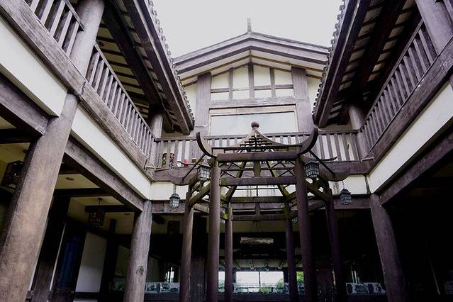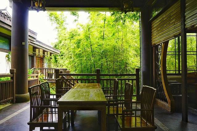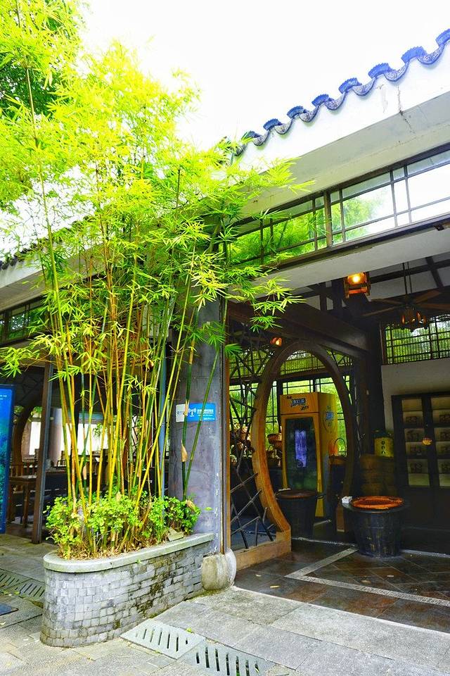 亭下,是一方水池,水很浅很清也很静,静得看不到一点波纹。水里的乌龟也是安安静静注视着来来往往的人群。四周那门栏窗,皆是细雕的花样,并无朱粉涂饰,一色水磨群墙。即便是室内,但属于山林古镇的气质仍是无处不在,茶舍的外面是一排一丛的修竹,里面是凉亭木椅长桌,若坐下慢慢饮一杯茶,恐怕这两耳之间一心之内都是高山流水潺潺,不觉捎来一阵古琴曲乐。