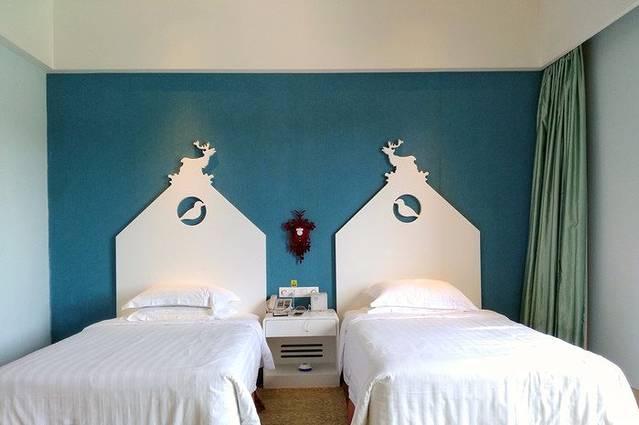 第二晚入住黑森林酒店,穿过一条长廊,两边是葱郁树木,穹顶上是蓝天白云的幕顶,宛若穿过童话的时光隧道。一进入房间,便被里面的装饰所吸引:精灵的麋鹿,可爱的咕咕鸟,或在床头或在墙上,如踏进了一个别致浪漫的童话世界。此刻,心隐隐雀跃。