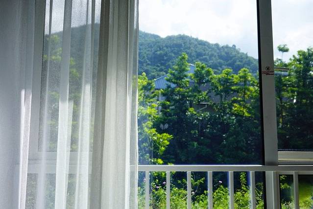 初秋的阳光从窗外照射进来,透过玻璃窗,被薄薄的纱窗帘筛成了斑驳柔和的光影,落在房间内,明亮而温柔,不仅照亮了房间,也温暖了此刻的我。透过窗户往外看,远处葱郁森林在阳光下显得格外翠绿而富有生机。