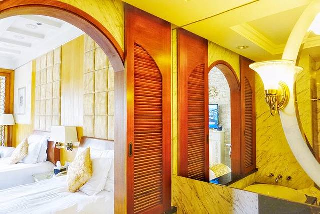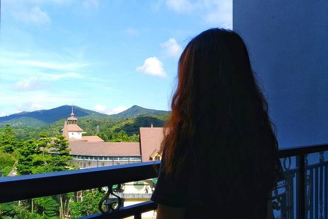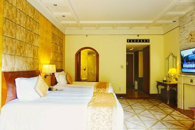 穿过曲曲折折的回廊,路过一个个阳光透过轻纱打在地毯上的窗,走进房间,迎面的是房间特有的恬淡的气息,干干净净的床铺,欧式典雅精致的装修,仿若踏进了欧洲城堡。