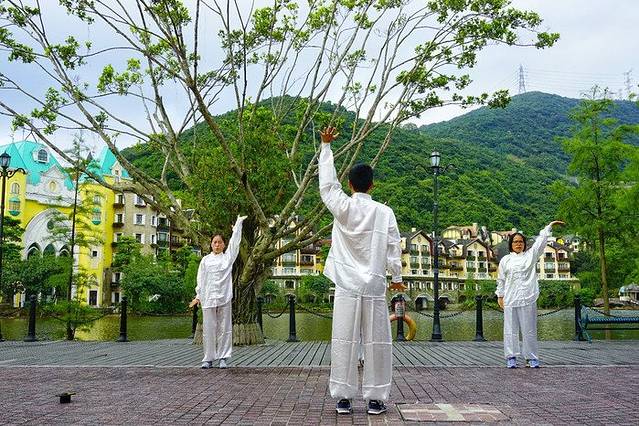 起势,双手放于前,慢慢迈开左腿,全身柔绵而有力地开始摆动,每一个关节灵巧地配合着,身心倾听着悠扬的禅乐,双手握拳,转腿,向前缓缓冲拳,推掌,轻如杨柳,坚如金石。