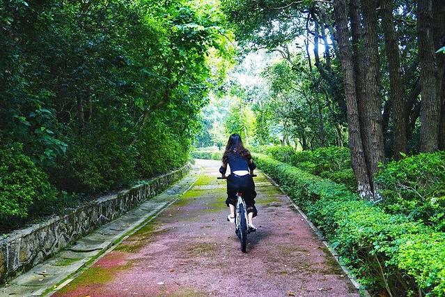 沿着绿道骑行,两边是郁郁苍苍的树木,清晨的山林,有些淡淡的薄雾尚未散去,看上去若有若无,柔柔的阳光洒在山林间,郁郁葱葱的叶子便有了深深浅浅的绿,鼻间萦绕的是清晨山林特有的清新气息,柔柔的凉凉的,格外舒适。山间清凉,完全感受不到初秋的气息,芳草如茵,野花簇簇,沐浴在清晨的阳光,耳畔是鸟儿在枝头欢快的鸣叫,使得静谧的山林显现出勃勃的生机。