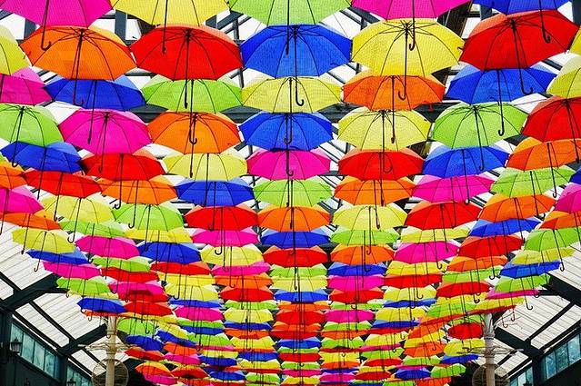 骑着车,在晨光中进入茶溪谷,经过茵特拉根集市街,抬头,看见诸多五颜六色的伞悬挂于上,红的、黄的、蓝的、紫的……五彩斑斓,绚丽多彩,心情不由更愉悦了。