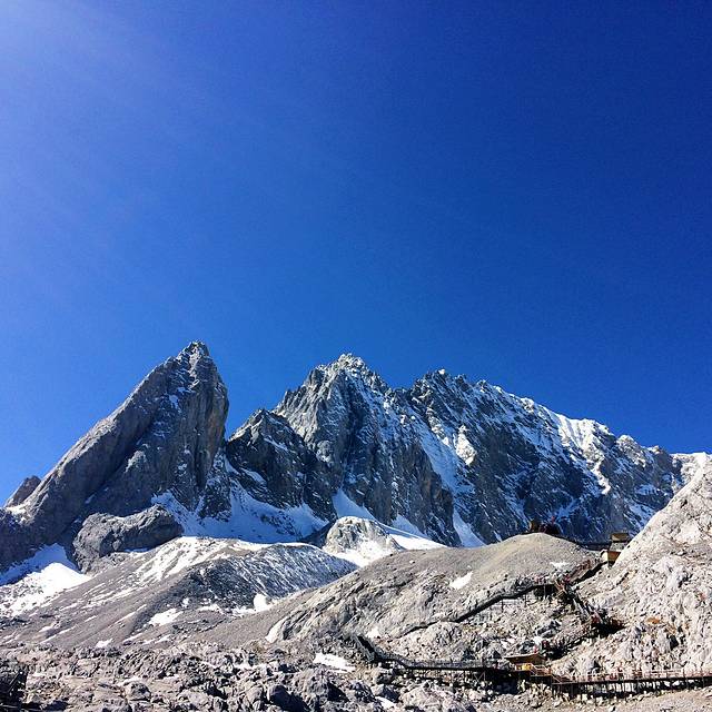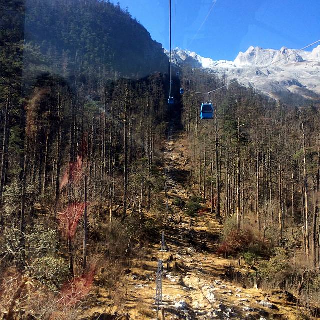 吃过饭直奔玉龙雪山,报的团羽绒服、氧气瓶都含在里面,刷了门票进来就直接排队坐大索道,划重点:坐索道的期间,从平原来的小伙伴们就可以吸氧了!(可是我没有吸氧,以为自己身强体壮,没想到下了索道后刚走不到50米就要趴倒在地了,完全不适应!)下了索道会有一个石碑,刻有现在所处于的高度,身体没有什么反应的可以接着往上走,我是头晕想吐,缓了一会,吃了点东西好一点,但是还是没多久就坐索道下去了。
