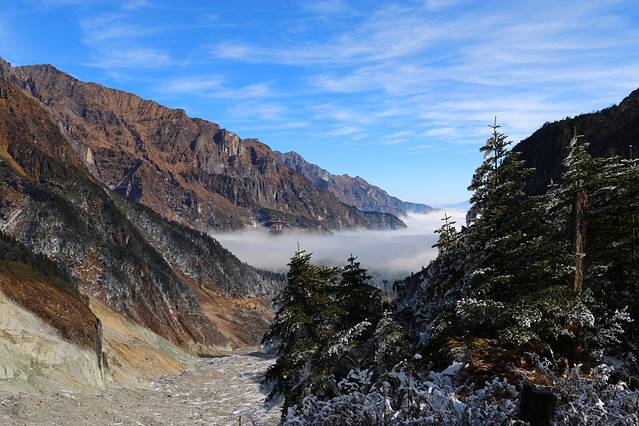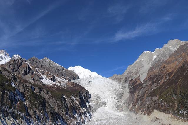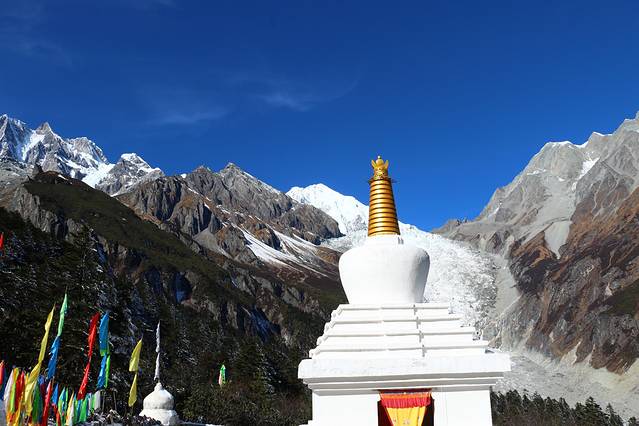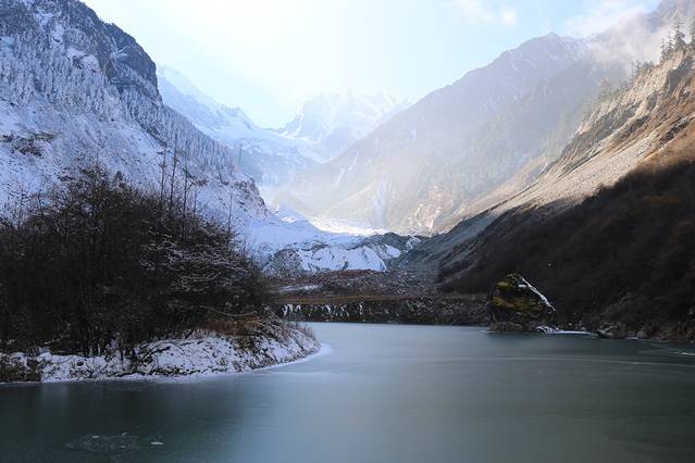 八点半酒店退完房,把车停在酒店,小街上吃完早餐,步行至游客中心购票上车(含门票及换乘车票,上最高平台的索道票在三号营地即坐缆车处购买)。约一小时的盘山公司路后到达三号营地。在此地先别停留,直接买票坐缆车奔最高点四号营地(在四号营地玩完后再看其它景点),四号营地离贡嘎主峰最近。2小时左右把上面的景点玩完,乘缆车返回三号营地,再徙步爬升一侧山峰,沿途穿越原始森林到达山顶,随后下至沟底看冰川(即高空缆车的正下方)。沿途雪景特美,运动量也够。到沟底躺在冰川上晒着暧暧的太阳。经过一个半小时后徙步回到原地(也可坐滑杆)即三号营地。随即上车至下一个景点(二号营地附近的“城门洞”),下车后徙步约半小时到达。冰冻的月牙湖如一面镜子,贡嘎主峰呈现在眼前,融化的冰雪在此形成溪流,人如在画中。半小时后原路徙步返回来前的下车点。此时可根据时间再游览其它风景点(返回磨西的最晚换乘车约四点左右)。四点半前乘换乘车返回磨西镇。稍作休息沿S211开车夜奔泸定桥(泸定县城中央。可在泸定桥吃晚饭)。到泸定桥已是晚上,就在桥旁边找家酒店住下,感受泸定小县城的夜生活。