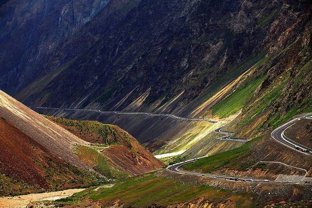 从巴音布鲁克出发,开始穿越独库公路(巴音布鲁克-独山子段)。独库公路又名天山公路,宛如一条巨龙盘卧天山。独库公路有三分之一是悬崖绝壁,五分之一的地段处于高山永冻层,跨越了天山近十条主要河流,翻越终年积雪的四个冰达坂,其驾驶难度可想而知。属于高原盘山公路而且弯道多,注意控制车速,车辆以SUV或者超野车为最佳。公路通车时间为5月-10月,最佳旅游时间为盛夏七八月份。夏季这条路段异常优美。