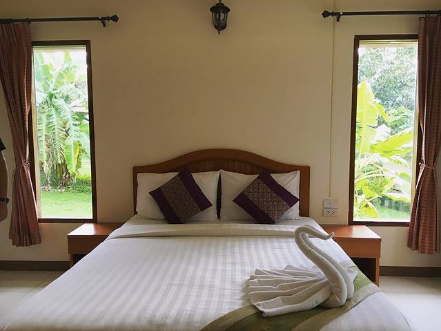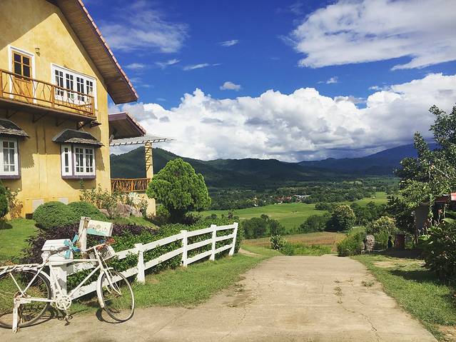 我们预定的是标准别墅,但是老板免费帮我们升级为山景豪华别墅。有点像度假村,但是到了晚上就特别荒凉。从早到晚都有免费接送到拜县中心,距离拜县中心大概十分钟车程吧。有免费早餐,炒饭特别好吃哈哈!老板的家乡在中国哦,但是在泰国长大的,所以普通话说的也挺6的啊。他们都挺热情的,租摩托才140B一天,不过摩托比较陈旧了,哈哈。不过,这家酒店真的好多虫子,花草树木太多了。