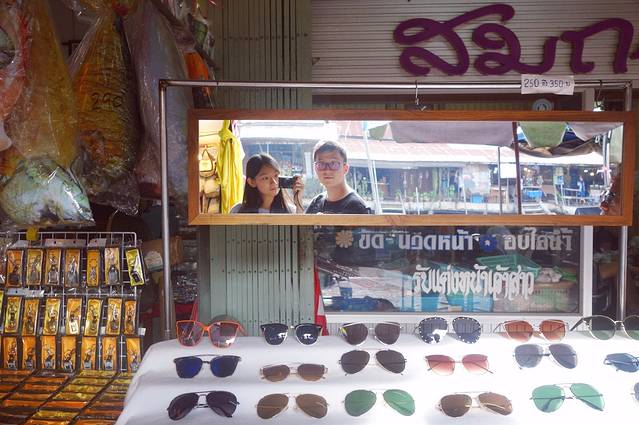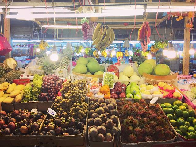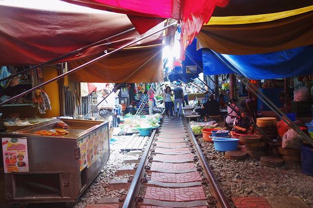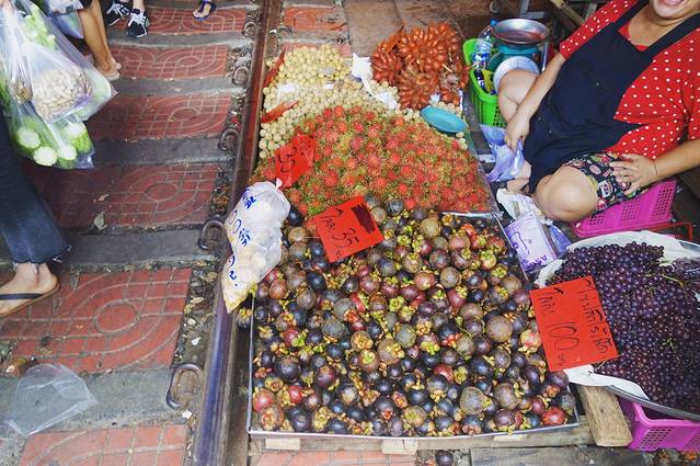 坐了两个小时的车才到美功铁道市场,去到那变成了阴天,非常闷热。铁道市场很挤,人来人往的。导游说这儿的水果是曼谷最便宜的,山竹才35B一斤,我之后在普吉和清迈看到的价格都要翻一倍。