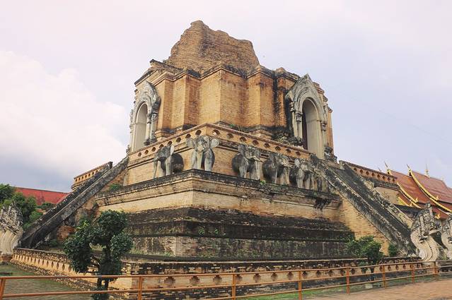 契迪龙寺,又称大佛塔寺,是清迈市内六大寺庙中最为著名也是最大的寺庙。1545年,清迈发生一次大地震和大风灾,佛塔的尖顶一夜之间塌毁,露出塔内的金身佛像,现在的寺庙是后人重新修复过的形象。塔身有六座象头雕塑,其中左侧五座是用水泥修复的赝品,最右侧象头才是为砖砌古迹。