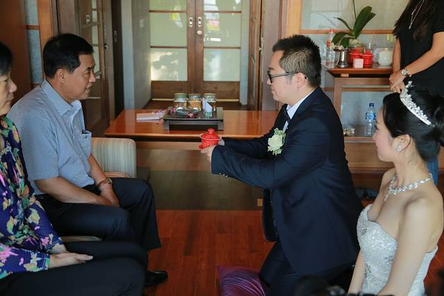 化妆完毕,尊重国内的习俗,安排了敬茶环节,也是在这个环节,第一次改口。父母们第一次上镜头有些紧张,老爸居然激动的一口把所有的茶喝光才想起来说祝福语,这以后应该是总会被提起的笑谈了吧。