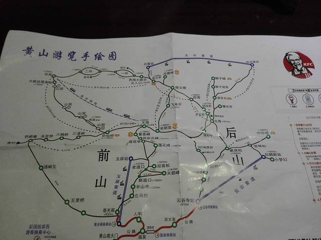 由于第一天并没有计划爬山所以并不着急(实际上如果想节约一下时间,这个点就可以直接买票上山了.....)由于坐了一夜的车所以第一天不打算爬山。在换乘中心对面有一家KFC,是个吃早餐的地方,小哥哥还会送你一张手绘的黄山风景区的图挺好的,还可以免费充电,免费打印照片。