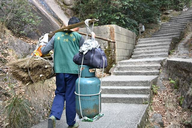 刚刚开始登山,还没有到真正的检票口,还要继续爬一段时间,在爬的时候你会看到一些挑夫他们把一些食物、煤气、用的吃的挑到山上,相比之下我们爬个山真的算不了什么了,所以山上的住宿还有饮食贵也有一定的道理,虽然贵我们不吃就行了。登山前级的带点水,山上矿泉水基本上都是10元/瓶,带点酸性饮料应该很爽口,想带的话也可以带点橘子类的水果。