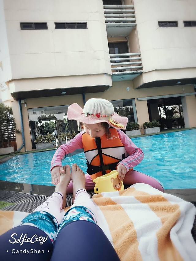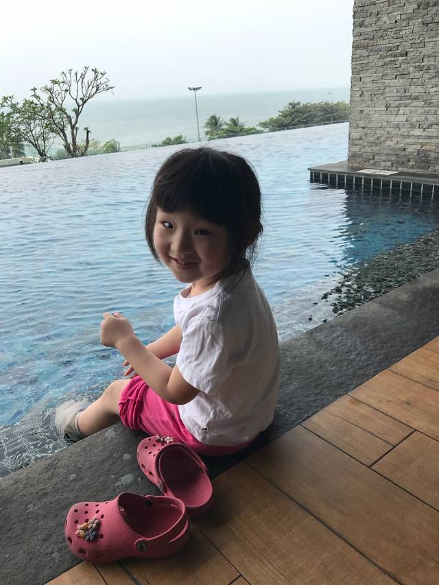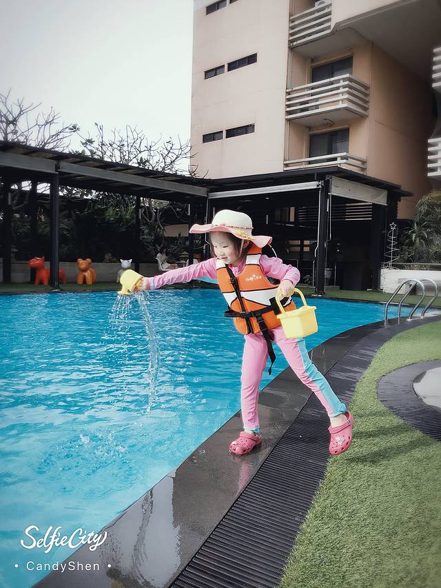 下午阳光明媚,原先打算带娃游泳的,但是刚从大冬天跑来,接触了水面还是凉意十足。为了后面几天旅途顺利,坚持不让娃下水,就在泳池边玩水吧。