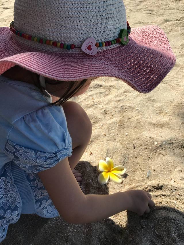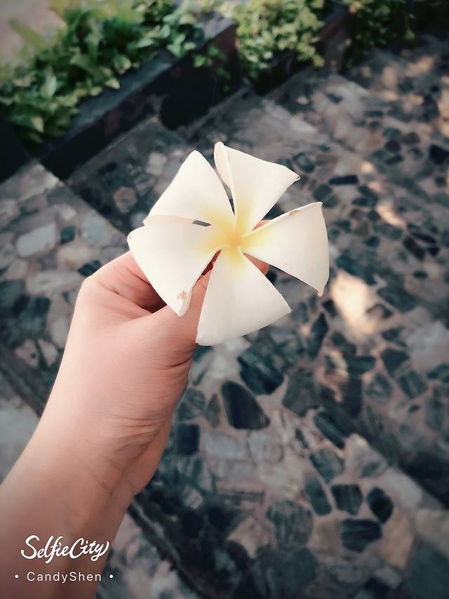 捡起路边的鸡蛋花,插在娃的头上。小美女一枚。
