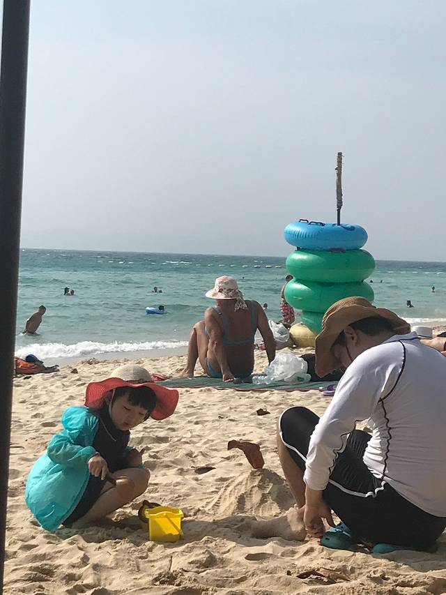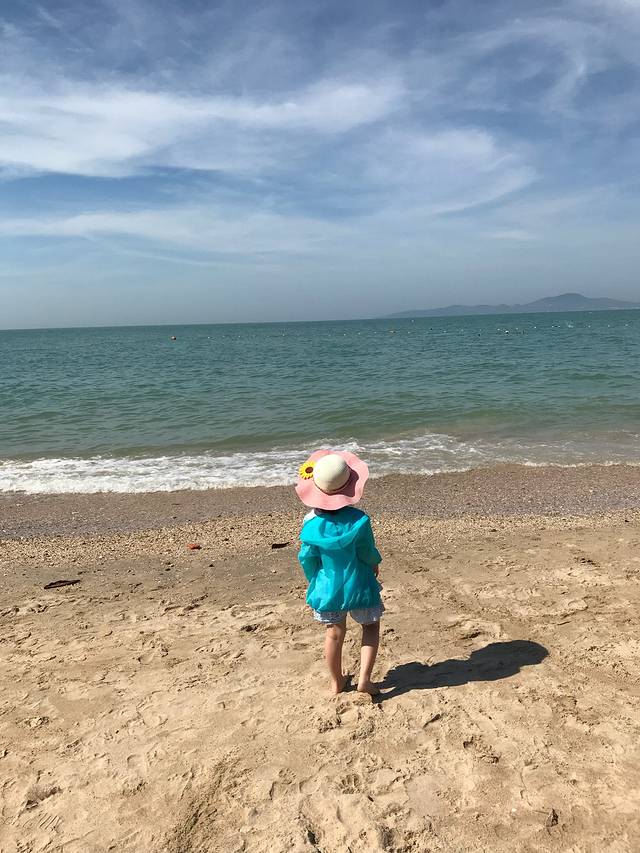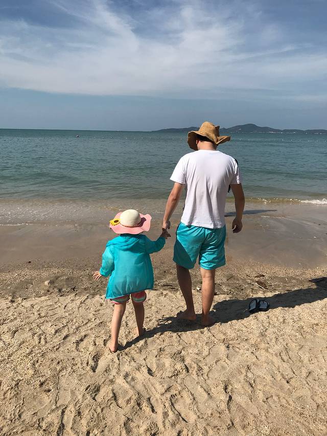 这父女俩的打扮,一个是夏天一个是秋天。不过靠近大海的心情都是一样的happy。